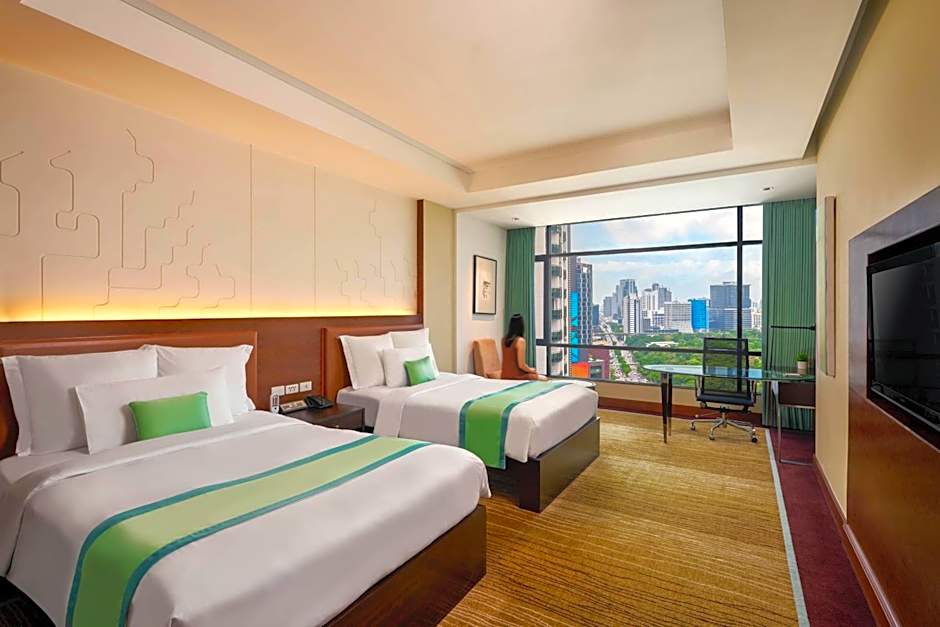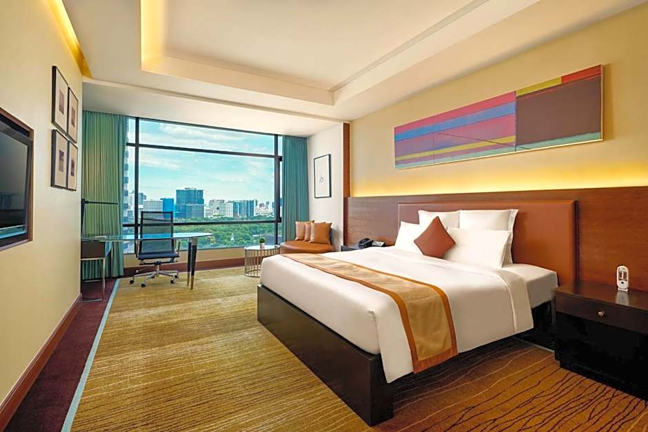 Decorated in comfortable earth tones, this spacious room features high ceilings and large windows with views of Bangkok city and Lumpini Park. Includes a flat-screen TV and an ergonomic work space.